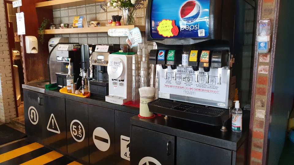 내부는 아늑하니 식사하기 좋더라고요. 다 트여있어도 뭔가 개인석 같은 느낌이 났었습니다. 제가 라라코스트를 꽤 좋아하는 편이어서 다른 지역을 가도 라라코스트를 갈 때가 꽤 있는데, 다 똑같은 라라코스트여도 내부는 상당히 다르더라고요. 그리고 알다시피 사진과 같이 커피와 음료는 공짜로 무한으로 떠 마실 수 있게 배치되어있습니다.