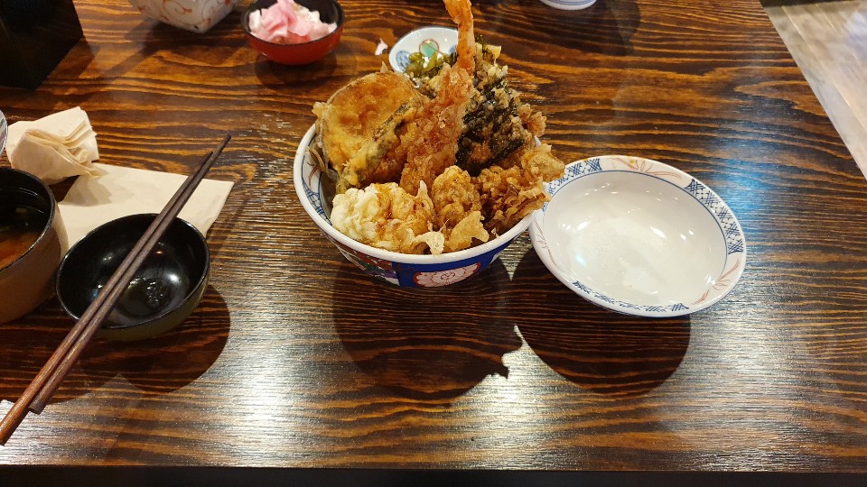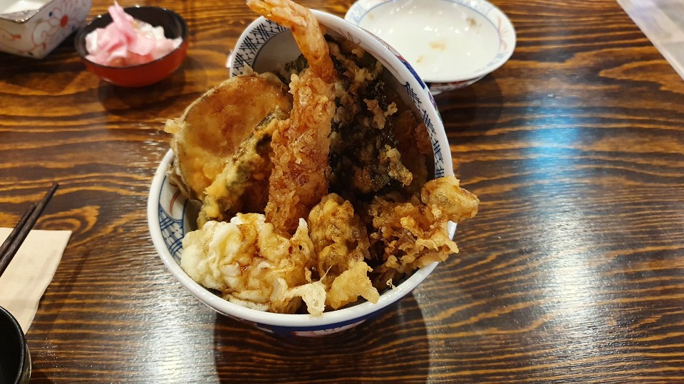 이것은 지인이 시킨 참가자미 텐동입니다. 메뉴판을 보면 알 수 있겠지만 온센 텐동에서 추가된 것은 연근이랑 참가자미뿐입니다.