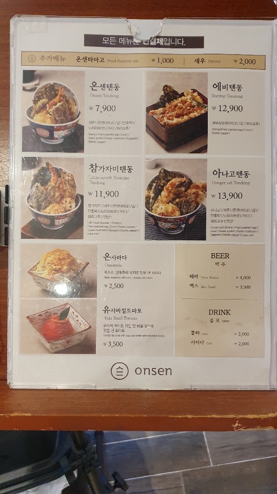 메뉴판은 카운터 앞에 있으니 카운터에서 선주문후 선결제를 하고 자리에 앉으시면 됩니다. 다른 블로그를 보니 웨이팅도 있을 수 있다던데, 저는 저녁시간 치고는 좀 이른 시간에 가서 그런지 웨이팅 할 정도로 사람이 많지는 않았습니다. 그래도 좌석은 거의 만석 가까이 되더라고요. 제가 텐동은 처음 먹어봐서 적당한 가격선을 모르겠는데, 어떤 메뉴를 시킬 지에 따라서 가격이 천차만별이긴 하지만 제가 시킨 메뉴 기준으로 보면 제 기준에서 이 정도 가격이면 싸거나 못해도 평균보다 높지는 않은 것 같더라고요. 근데, 유자 바질 토마토는 진짜 입 크게 벌리고 먹으면 한 입에 먹을 수 있어서 다 먹고 나니 허무해져서 조금 비싼 감이 없지 않아 있었습니다. 그리고 저희는 참가자미 텐동이랑 온센 텐동이랑 유자 바질 토마토를 주문하였습니다.