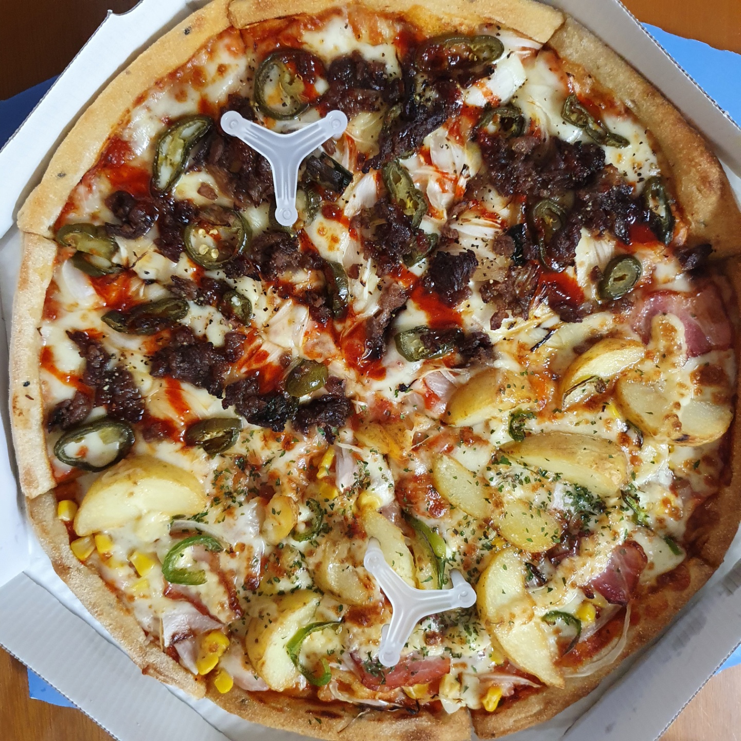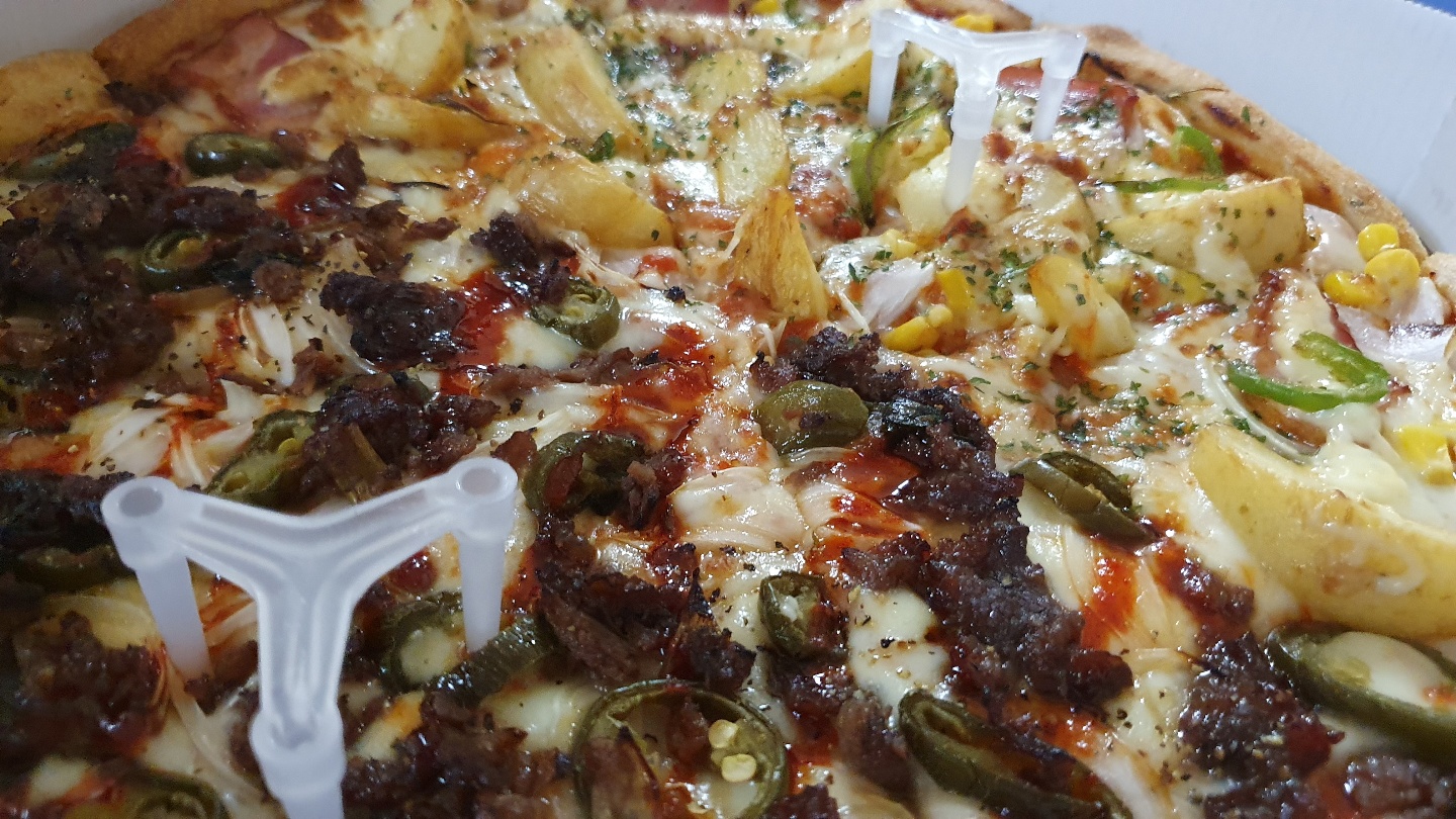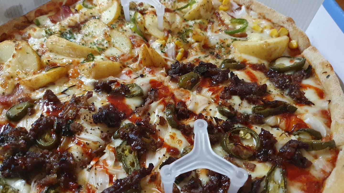 이 메뉴는 할라불고기 피자와 진짜감자피자로 구성된 청년피자에서 파는 메뉴 중 하나인 반반 피자입니다. 할라피뇨가 들어간 것을 별로 안 좋아하시는 분들은 딱히 추천드리지는 않지만 할라피뇨가 들어가도 상관없으신 분들은 할라불고기 피자 정말 강추합니다. 진짜감자피자도 감자도 많이 들어가고 맛도 무난하게 맛있어서 같이 먹기에도 좋았어요. 진짜로 청년피자를 처음 드시는 분들에게 청년피자 메뉴 추천을 한다면 무조건 반반 피자 선택하시고 메뉴 두 가지씩 한번 드셔 보는 것도 좋을 것 같습니다.