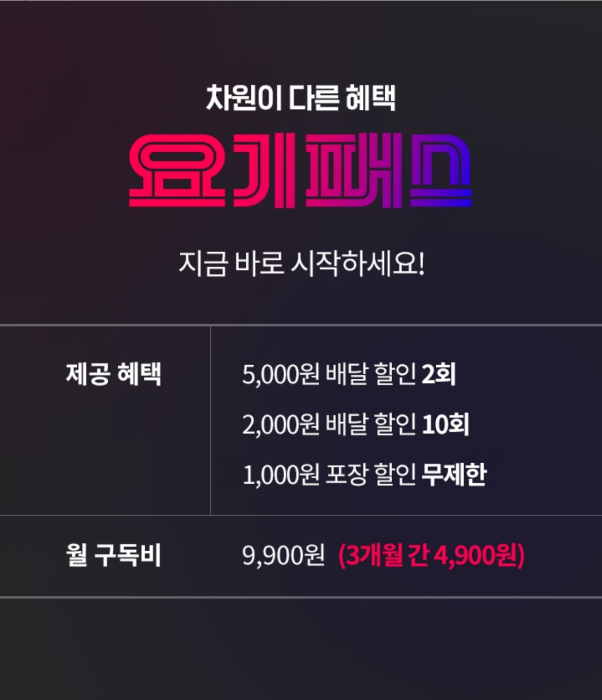 마지막으로 배달 음식을 싸게 먹을 수 있는 요기요 배달앱 이벤트 중 하나인 요기패스 할인에 관련된 것을 설명하려고 합니다. 요기패스 할인에 관련된 이야기를 한 후에는 개인적인 생각 및 간단한 이야기를 해보려고 합니다. 일단 요기패스 할인에 관한 이야기는 요기패스가 원래는 9900원이었는데, 3개월 간 4900원으로 할인을 한다는 것입니다. 일단 결제를 하고 나면 정기결제가 되니 나중에 불필요할 시에는 미리 정기결제를 해지해야 하니 주의사항을 잘 살펴보고 나중에 직접 정기결제 해제를 하는 것을 권장드립니다.