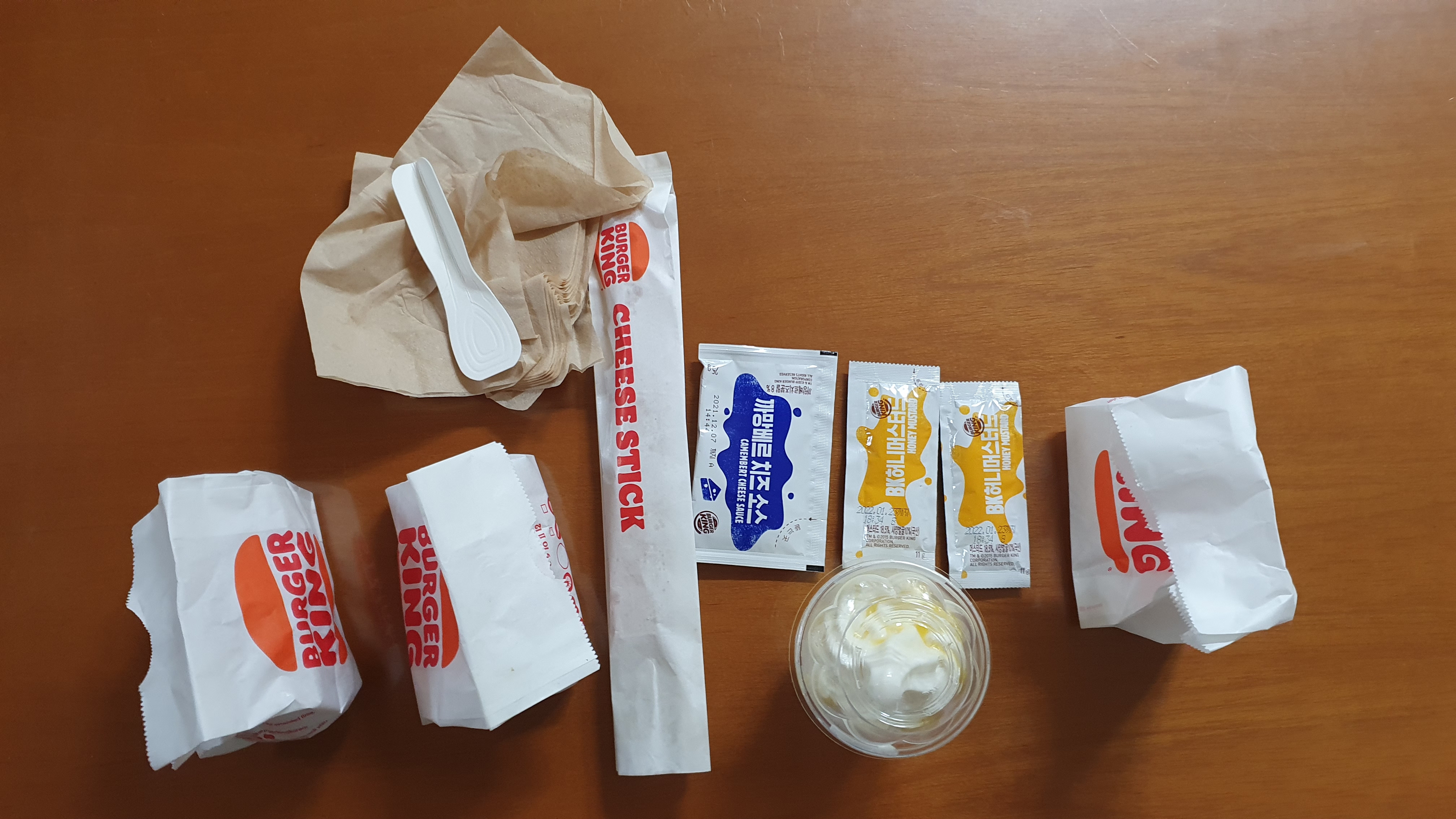 이번에 주문한 사이드 메뉴들과 디저트입니다. 크리미모짜볼, 바삭킹, 앵그리 너겟킹, 치즈스틱, 선데이 아이스크림 바나나맛을 주문했습니다. 앵그리 너겟킹은 원래 아예 살 예정이 없었지만 가서 주문할 때 보니까 어떤 류의 매콤한 맛이 날지 궁금해지더라고요. 그래서 한번 주문해보았습니다. ㅋㅋㅋ 근데, 자세한 맛은 아래에서 얘기하겠지만 결론적으로 먼저 얘기하자면 앵그리 너겟킹은 제 취향이 아니더라고요...ㅠㅠ ㅎㅎ 그래서 이날 이후로 앵그리 너겟킹은 한 번도 주문해본 적이 없습니다.....