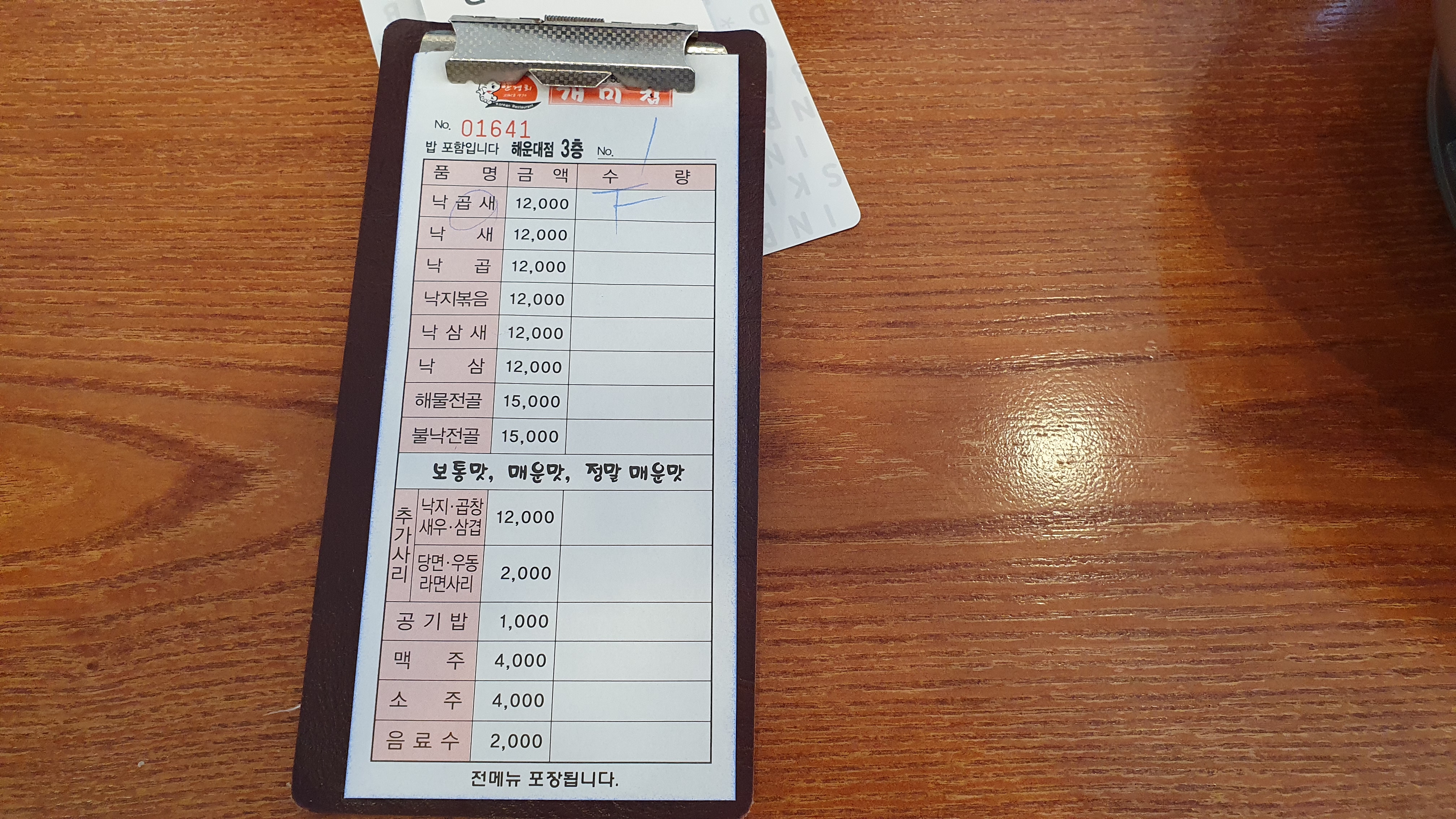 부산 해운대의 개미집 메뉴판입니다. 현재는 가격은 좀 올랐으니, 가격보다 메뉴를 살펴보시는 것을 추천드립니다. 저희는 3명이어서 낙곱새 보통맛으로 3개를 하였습니다.