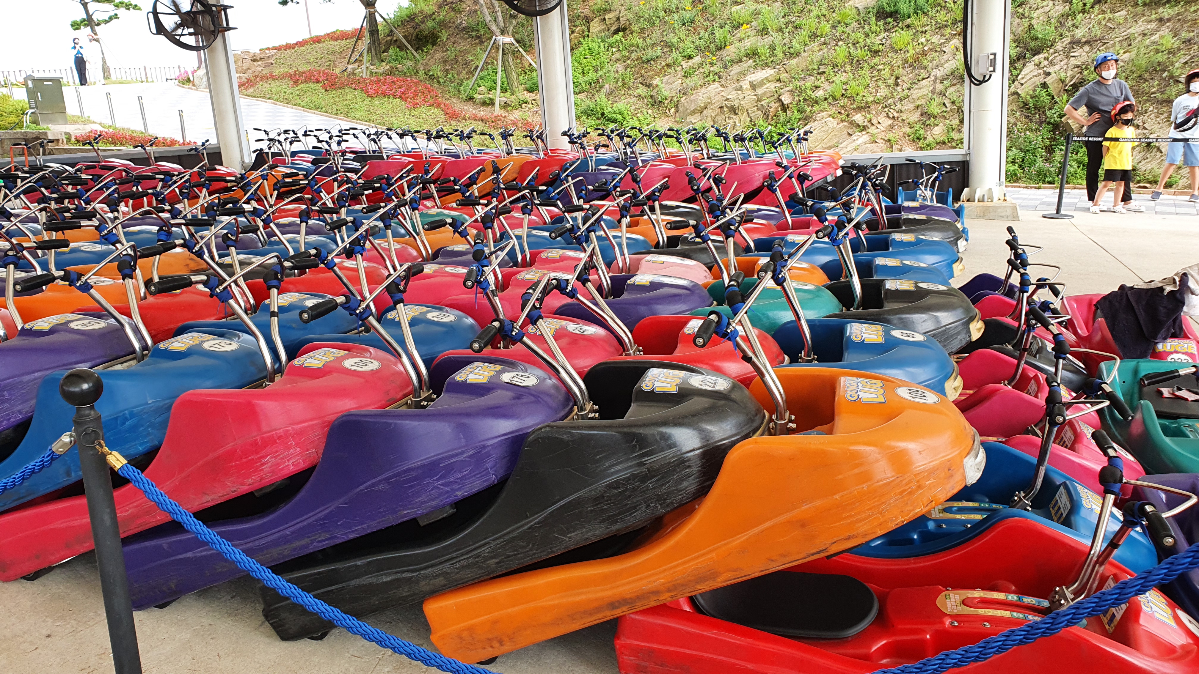 이렇게 여러 루지가 있는데, 당연히 저희는 이쪽에 있는 거 꺼내서 탄 것은 아니고 잘 정리되어 있는 쪽에서 한 명씩 탔어요.