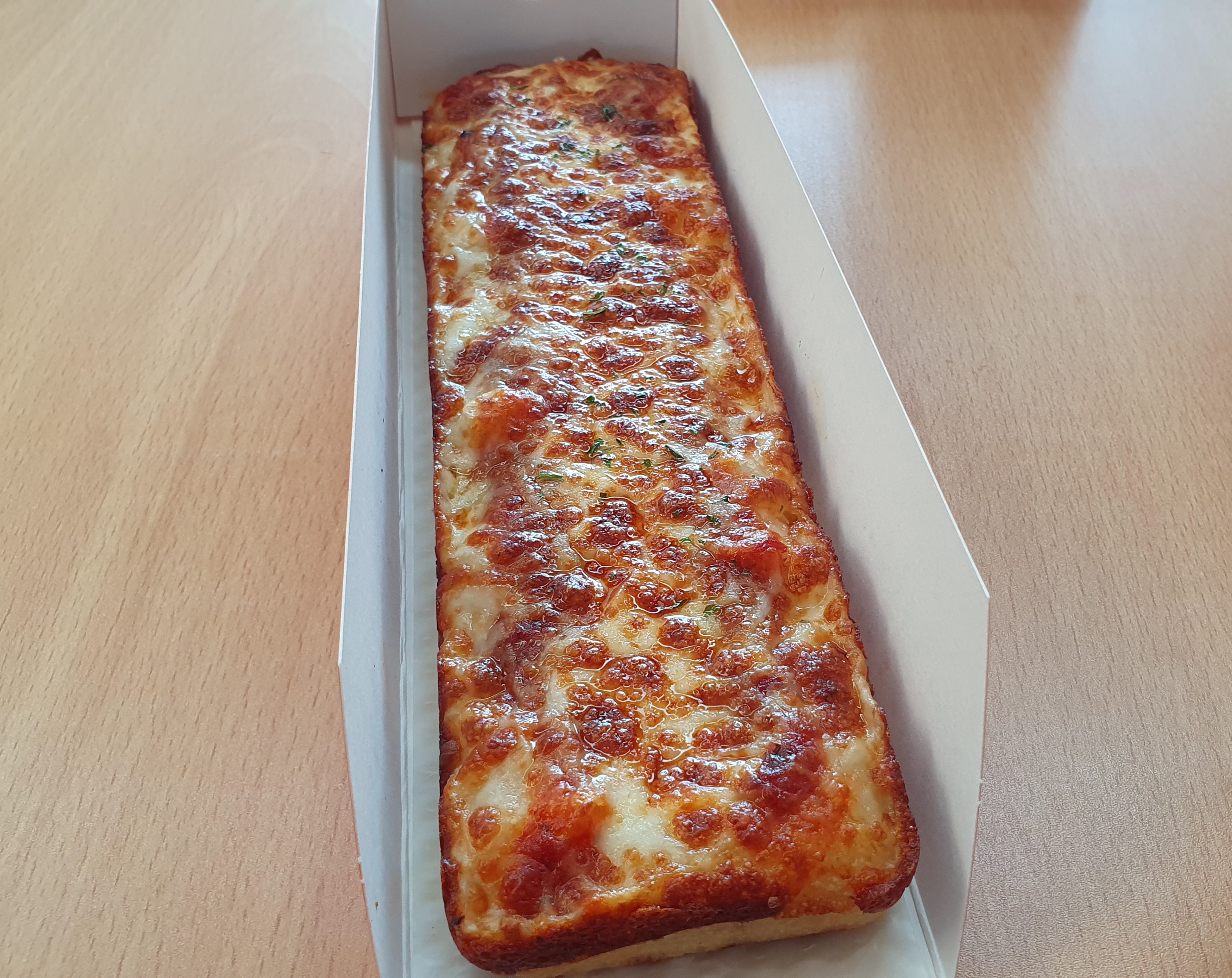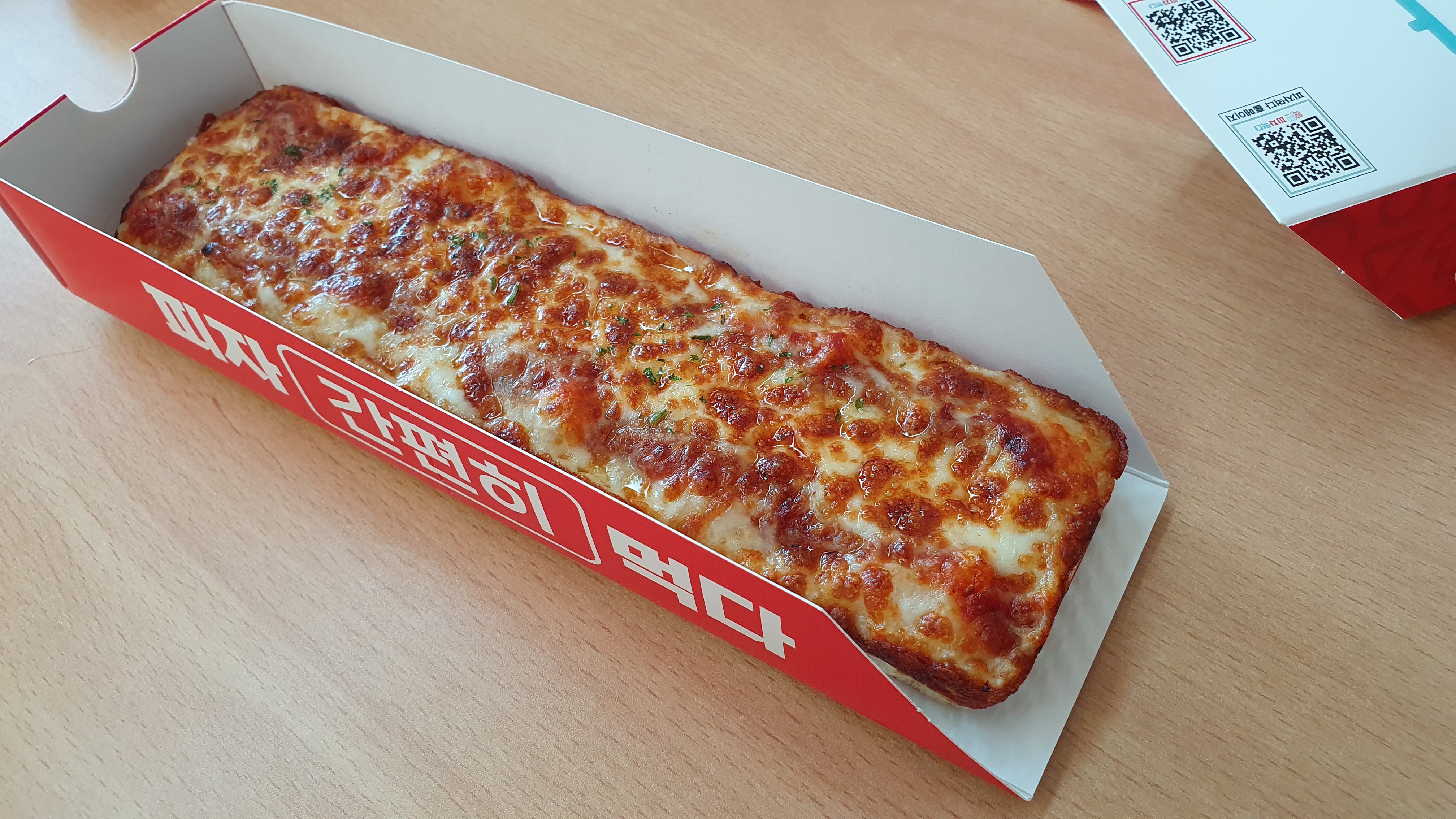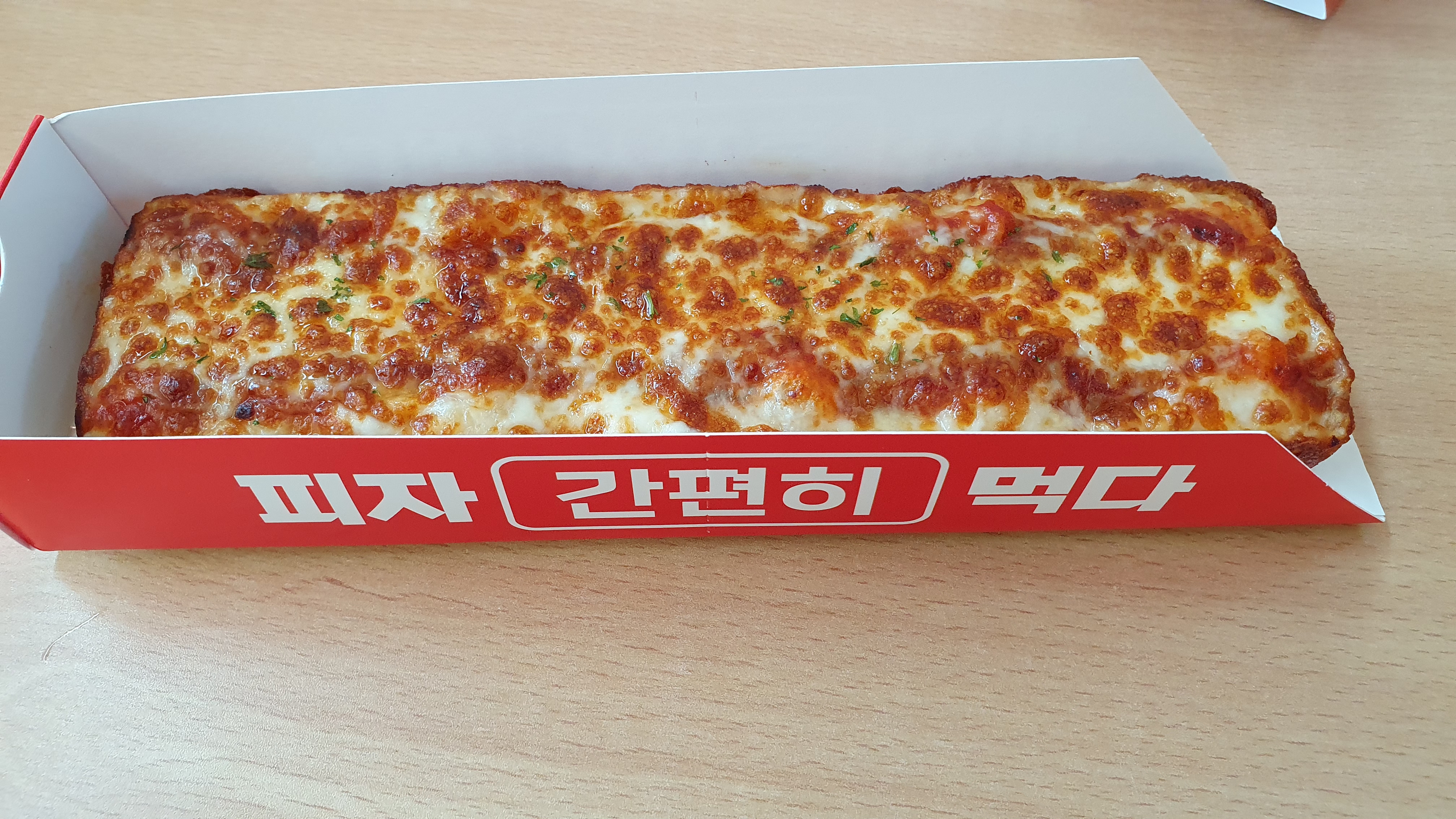 '피자먹다'의 포장입니다. 피자 모양에 알맞게 간단한 사각형으로 되어있고 들고 다니며 먹기 좋게 디자인되어 있어서 밖에서 바로 꺼내먹기 되게 좋은 거 같아요. ㅎㅎㅎ