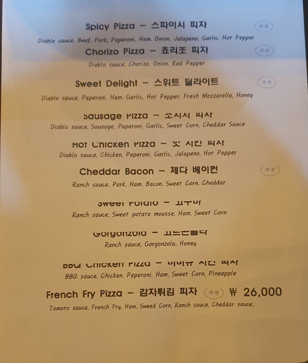 약간 펍 같은 느낌의 피자집으로 외부에서 간판으로 봤을 때는 배달위주로 많이 할 거 같은 느낌이고 내부로 들어갔을 때는 펍위주의 느낌이 좀 있는 그런 피자집이었습니다.