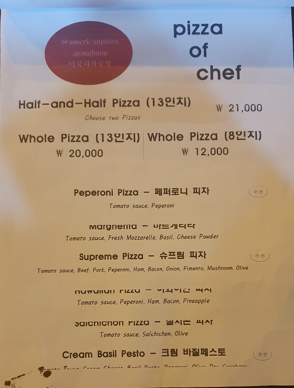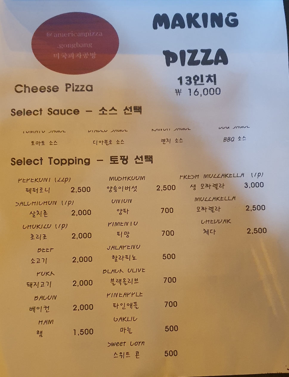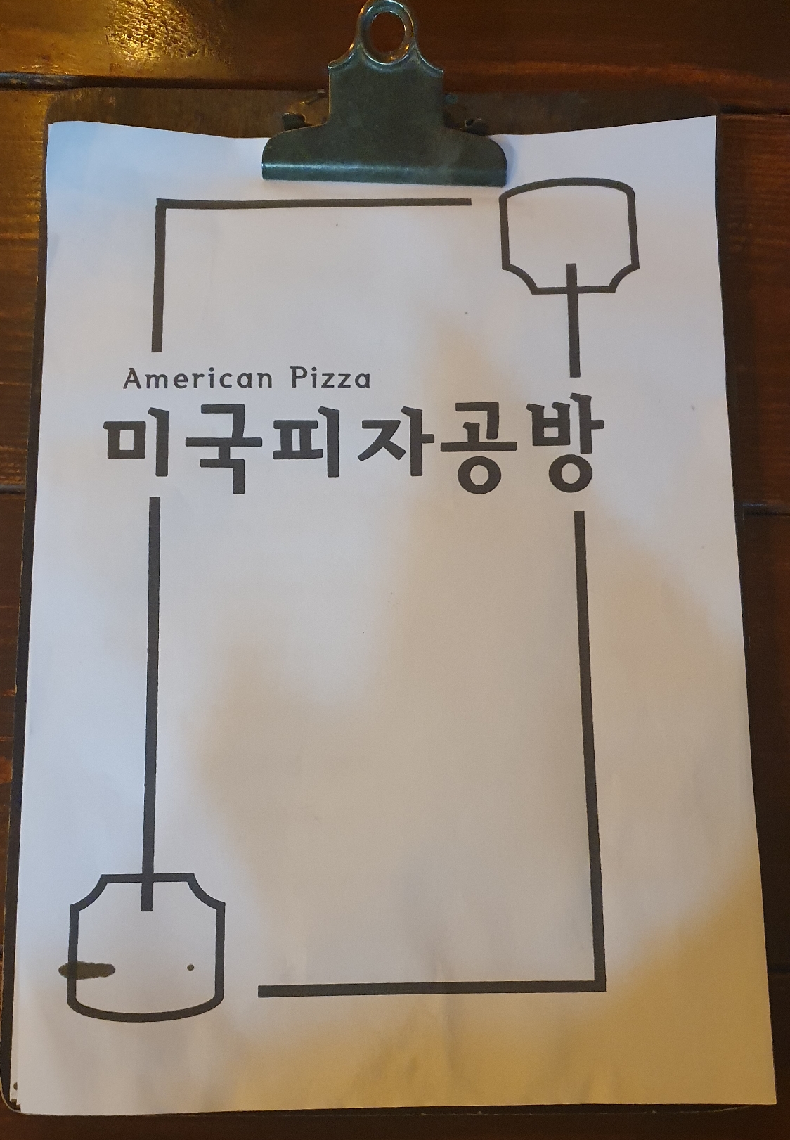 강릉 피자맛집인 미국피자공방의 메뉴판 앞페이지입니다.