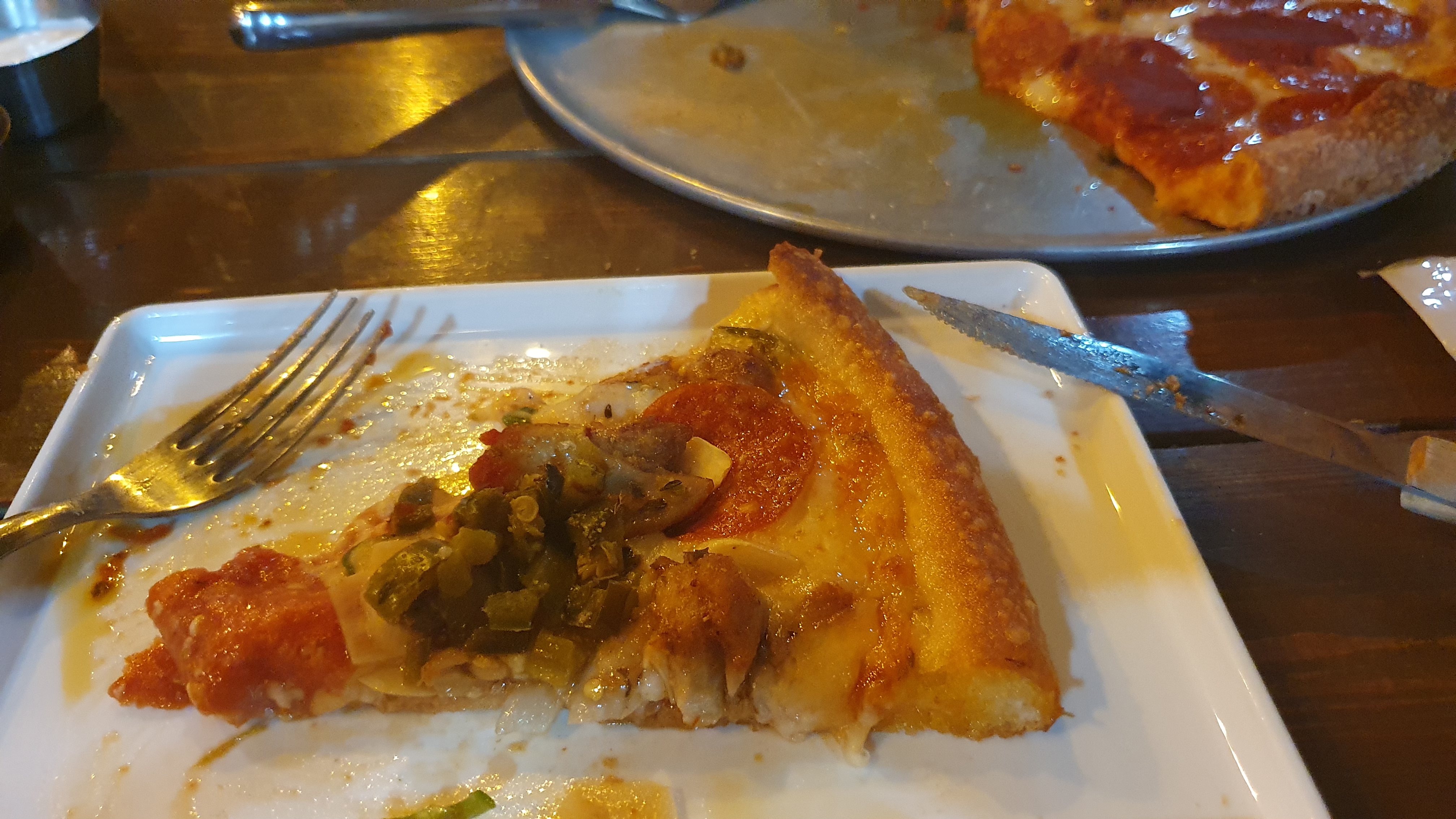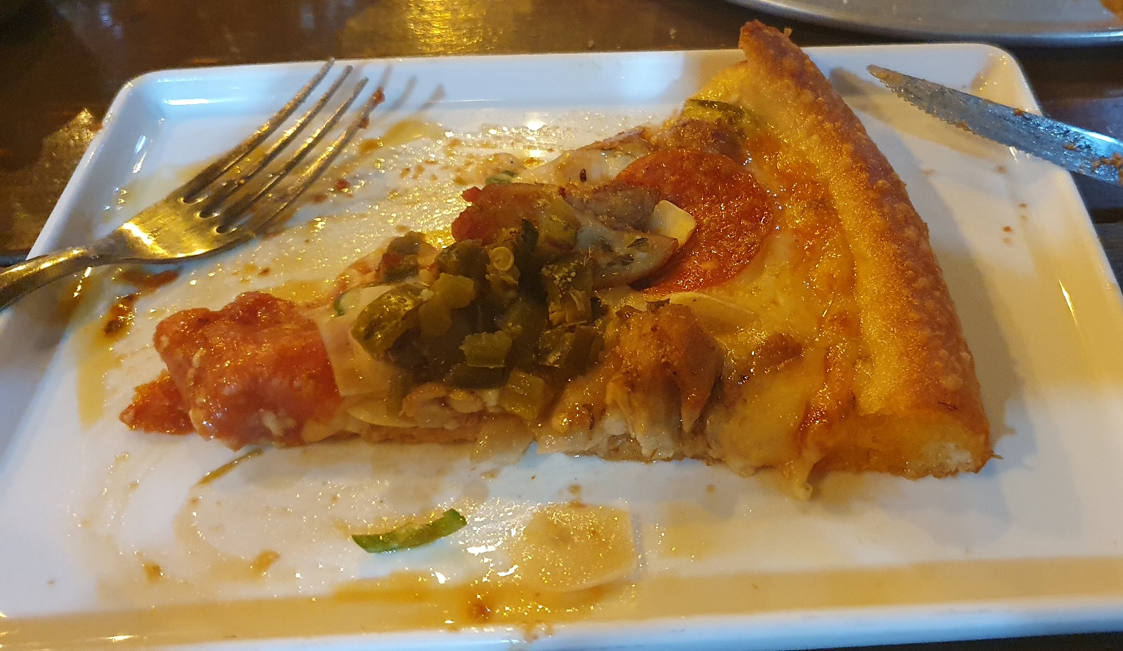 제가 주문한 하프 앤 하프 피자입니다. 핫치킨과 페퍼로니로 구성되어 있고 전체적으로 피자도우는 바삭바삭한 도우로 두께는 씬과 일반 도우의 사이쯤 되는 그런 느낌이었어요.