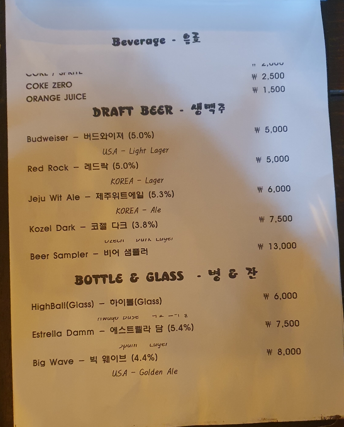 메뉴판에 있는 마실 음료와 술입니다. 저희는 음료는 콜라로 했어요.