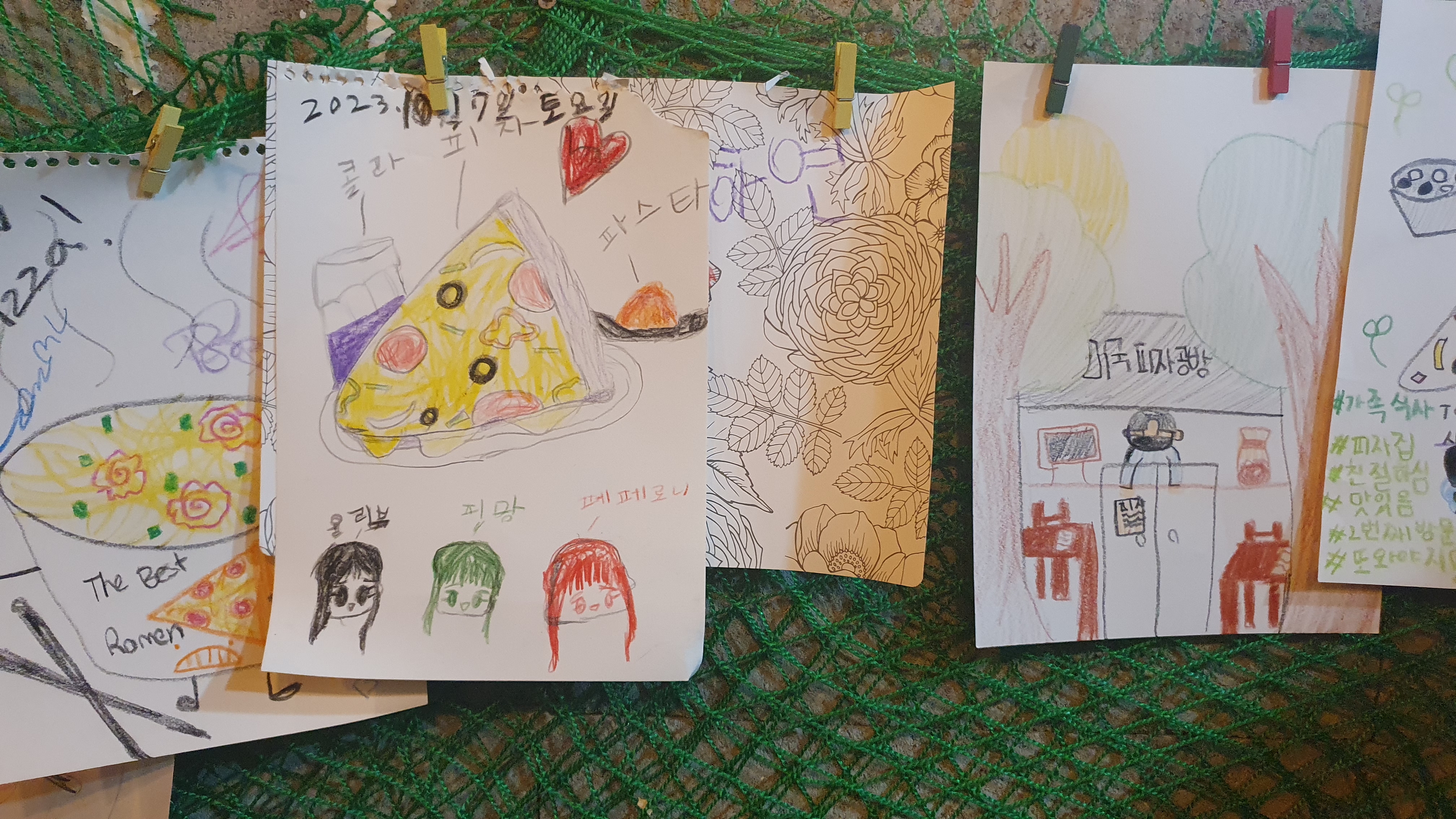 이렇게 애기들이 그려놓은 그림도 붙여져 있더라고요. ㅎㅎㅎ