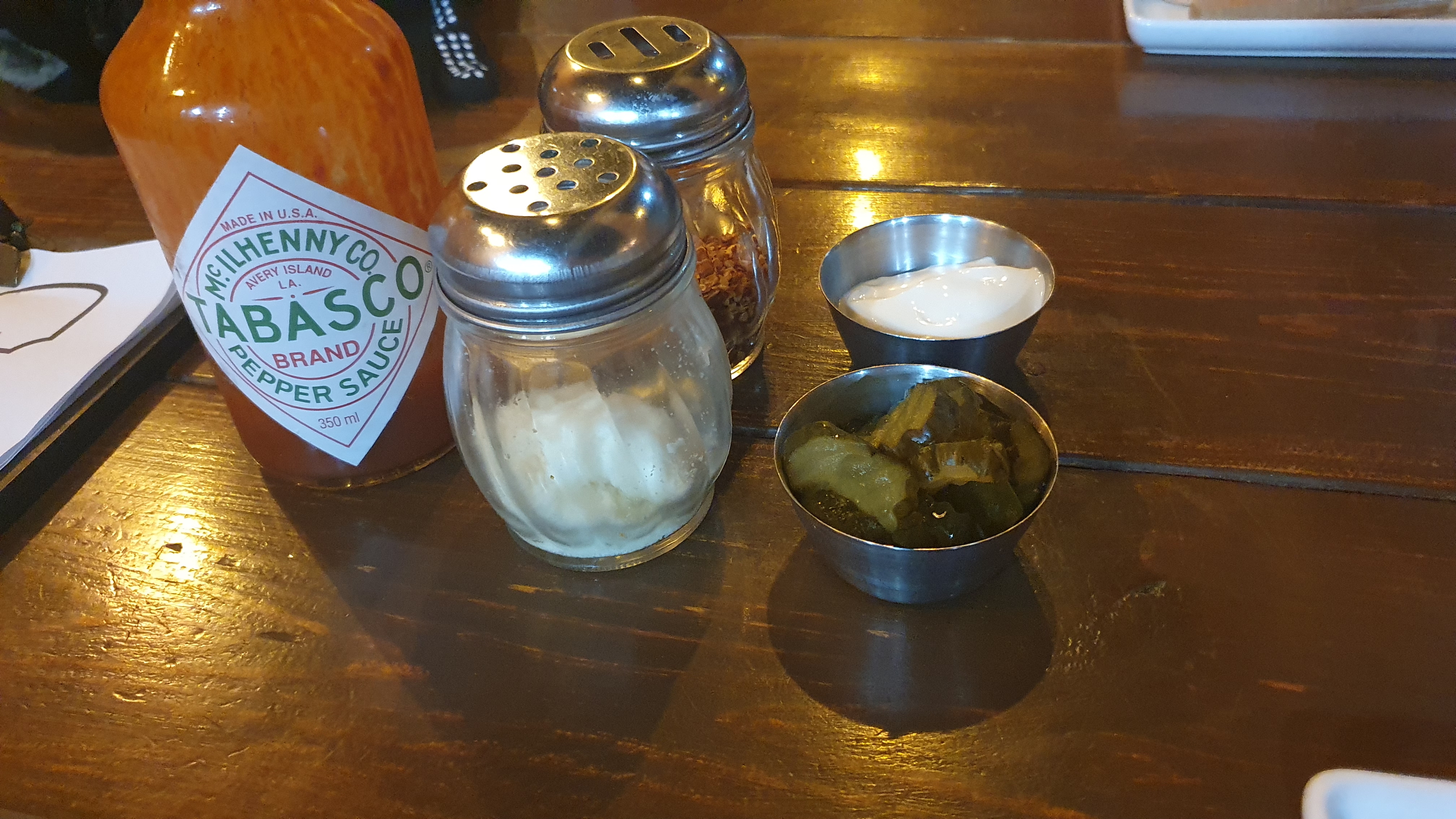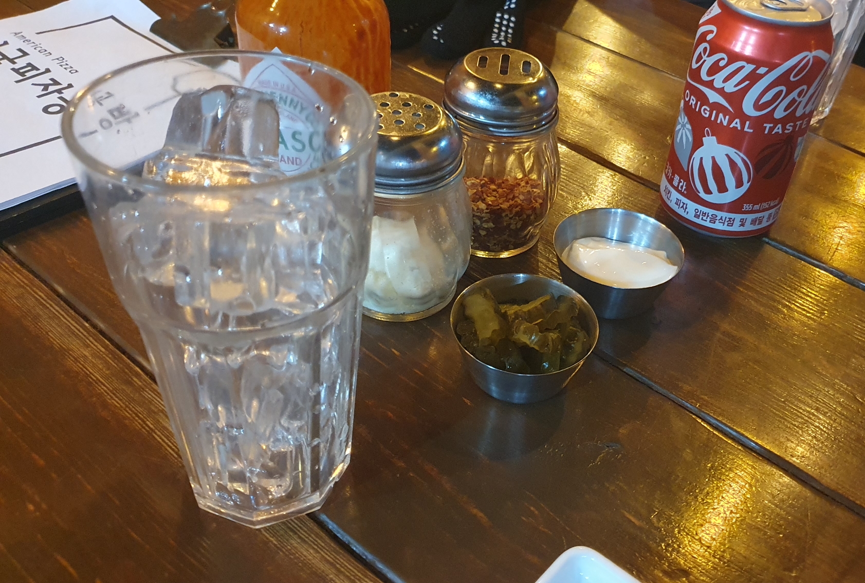 피자랑 같이 먹을 수 있는 소스와 여러 조미료와 피클입니다. 타바스코와 피클 말고 나머지는 뭔지 잘은 모르겠네요. ㅎㅎ