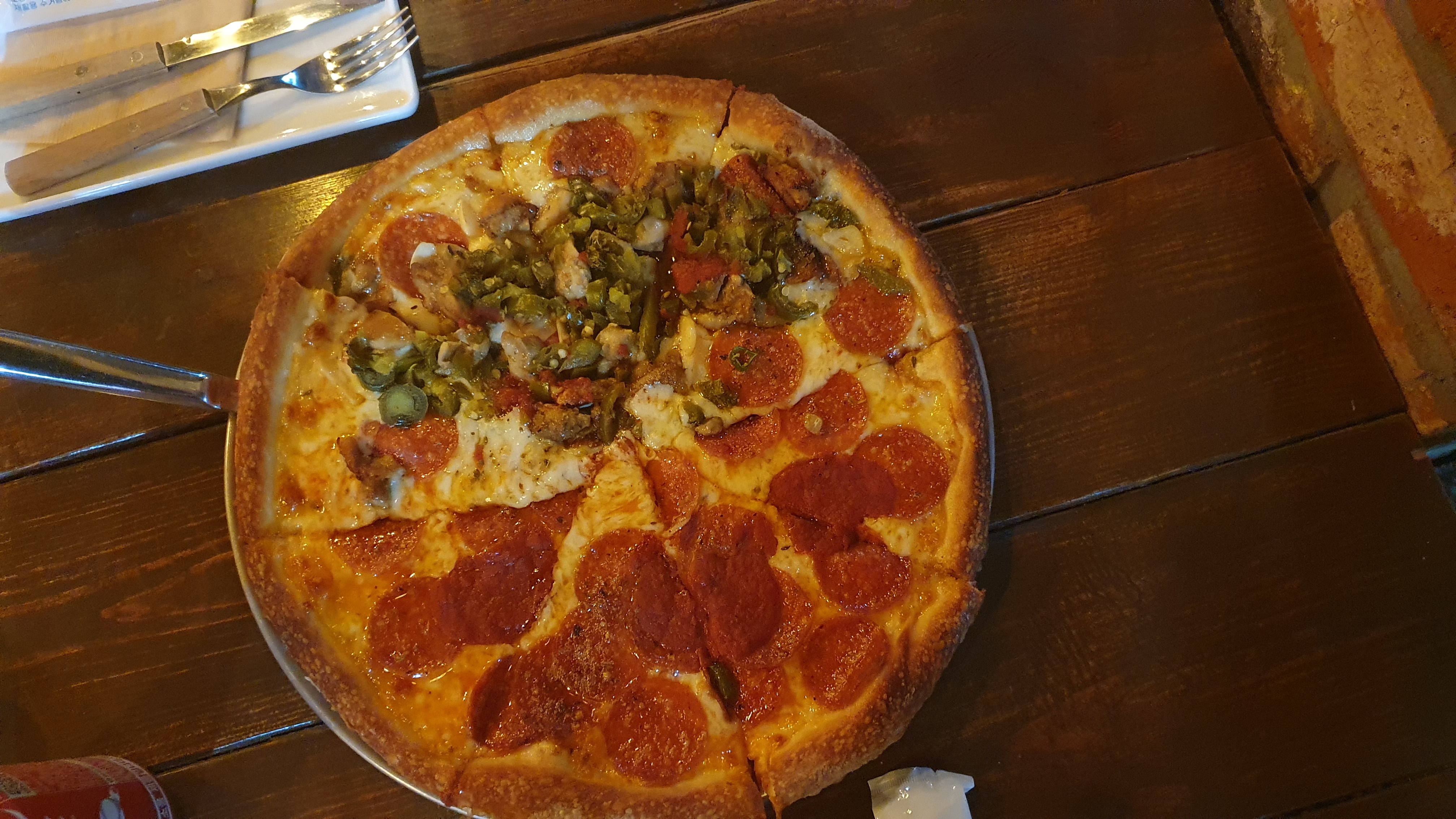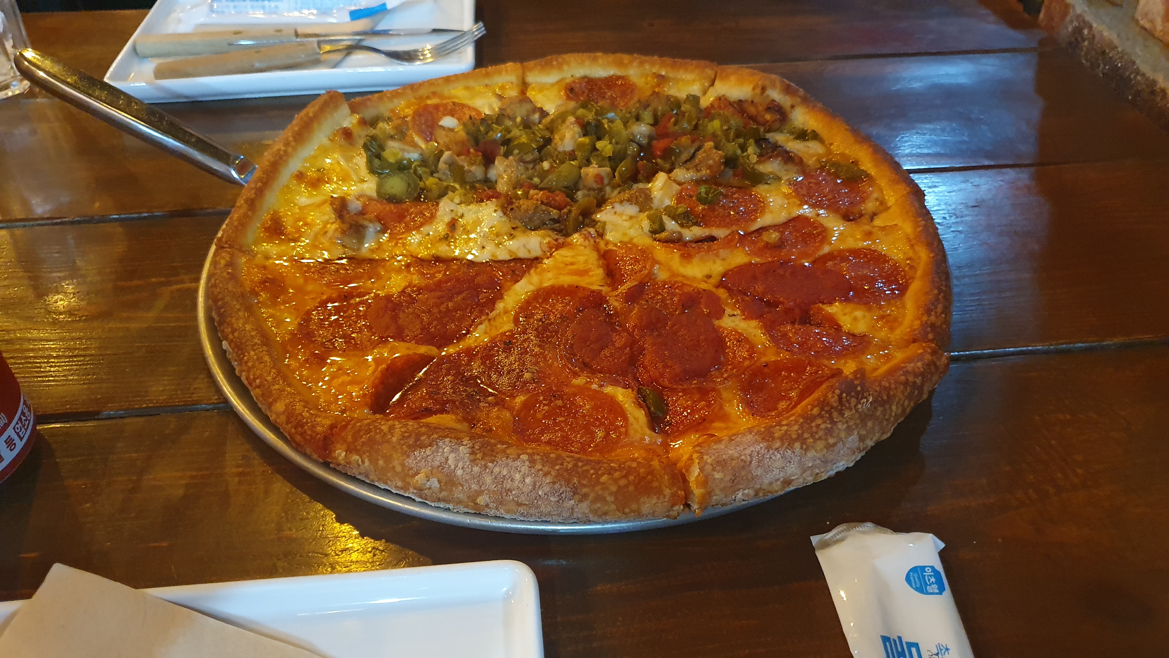 서로 선호하는 게 달라서 하프 앤 하프 피자로 페퍼로니랑 핫치킨의 반반으로 구성된 피자를 선택했었어요.