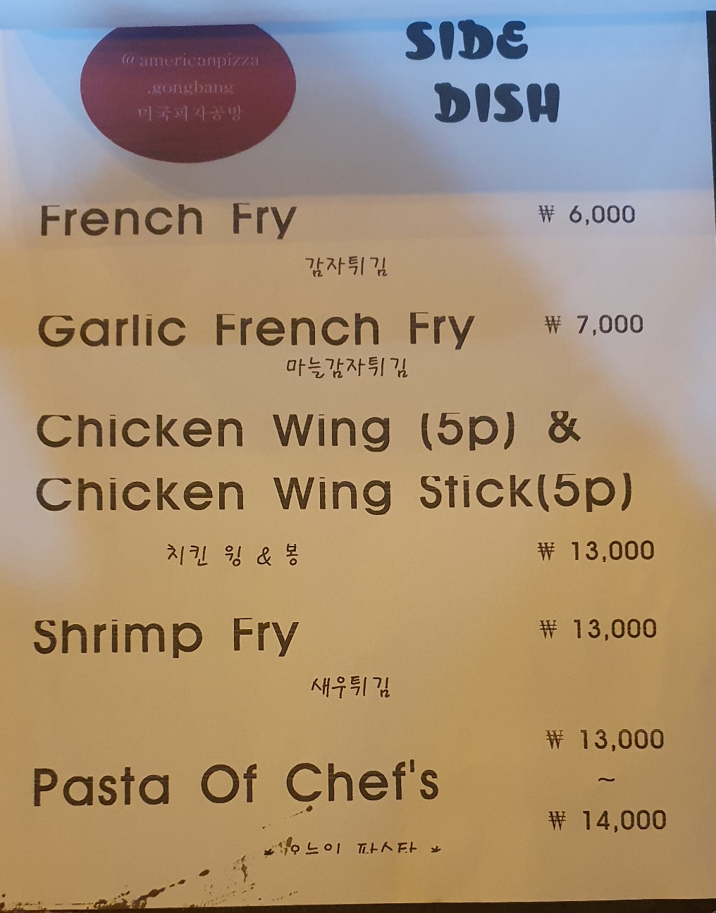 미국피자공방의 사이드메뉴들입니다. 이것저것 다양하게 있네요. ㅎㅎㅎ