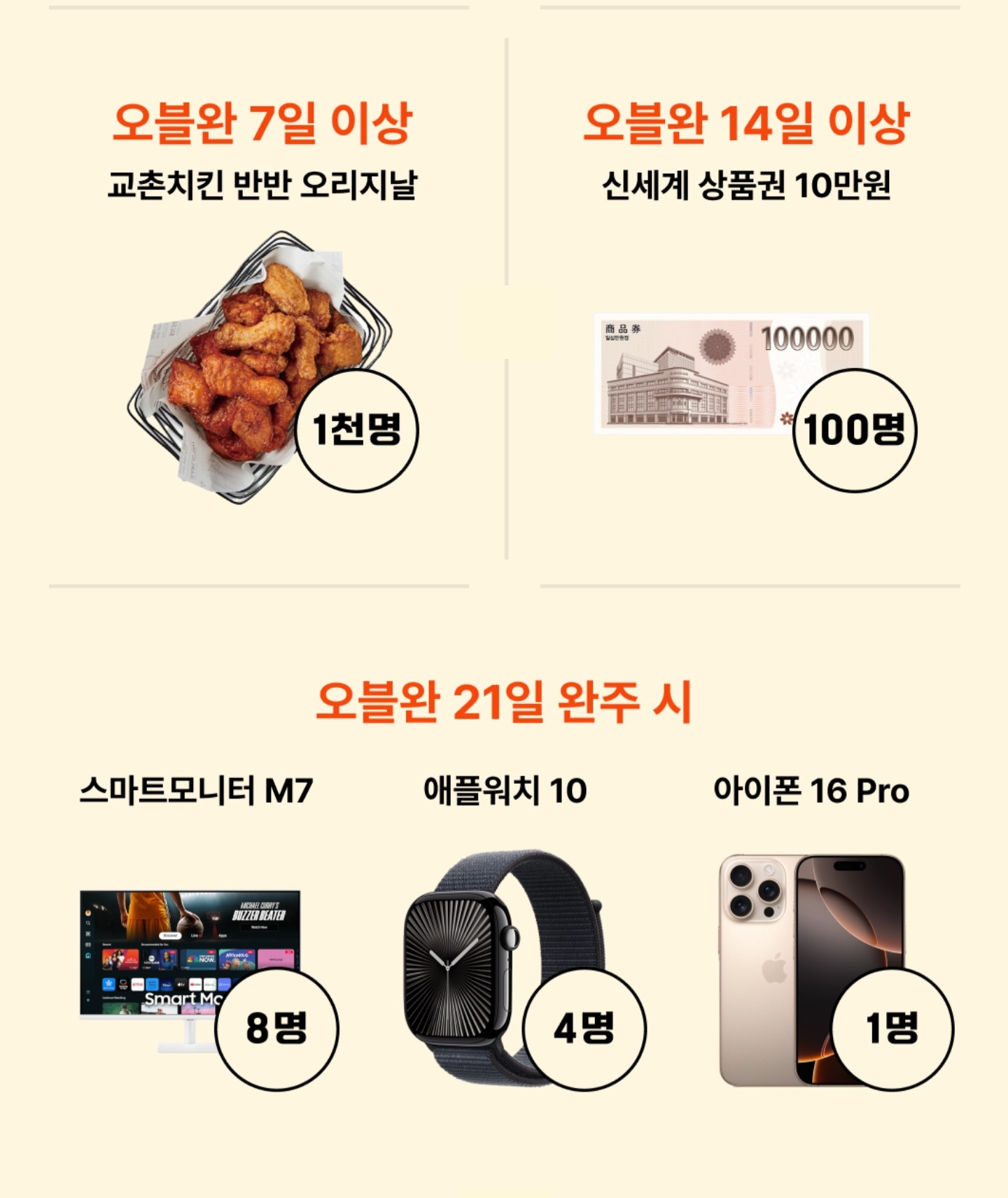 21일까지 전부 참여했을 경우에는 아이폰 16 Pro, 애플워치 10, 스마트모니터 M7 등을 얻을 수 있는 기회가 주어집니다.