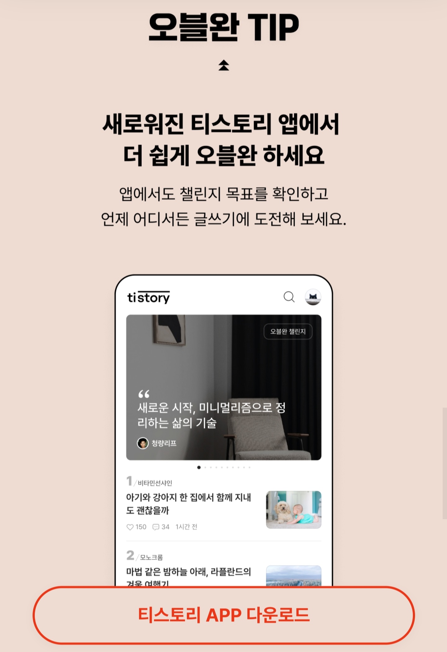아까 위에서 티스토리 앱으로는 챌린지 출석 확인이 어려울 거 같다고는 했지만 이렇게 티스토리 앱을 홍보하는 것을 보니 앱으로도 여러모로 확인이 가능하도록 만들어주지 않을까 싶습니다. ㅎㅎ